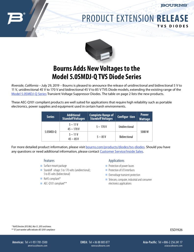 2 Aug 2019 BOURNS ADDS NEW VOLTAGES TO THE MODEL 5.0SMDJ-Q TVS DIODE SERIES by LT2 | posted in: Other | 0