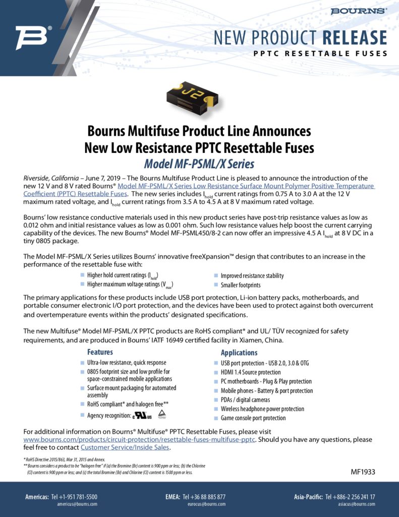 13 Jun 2019 BOURNS MULTIFUSE PRODUCT LINE ANNOUNCES NEW LOW RESISTANCE PPTC RESETTABLE FUSES by LT2 | posted in: Other | 0