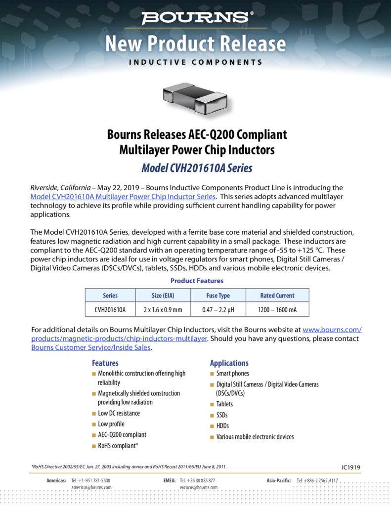 28 May 2019 BOURNS RELEASES AEC-Q200 COMPLIANT MULTILAYER POWER CHIP INDUCTORS by LT2 | posted in: Other | 0