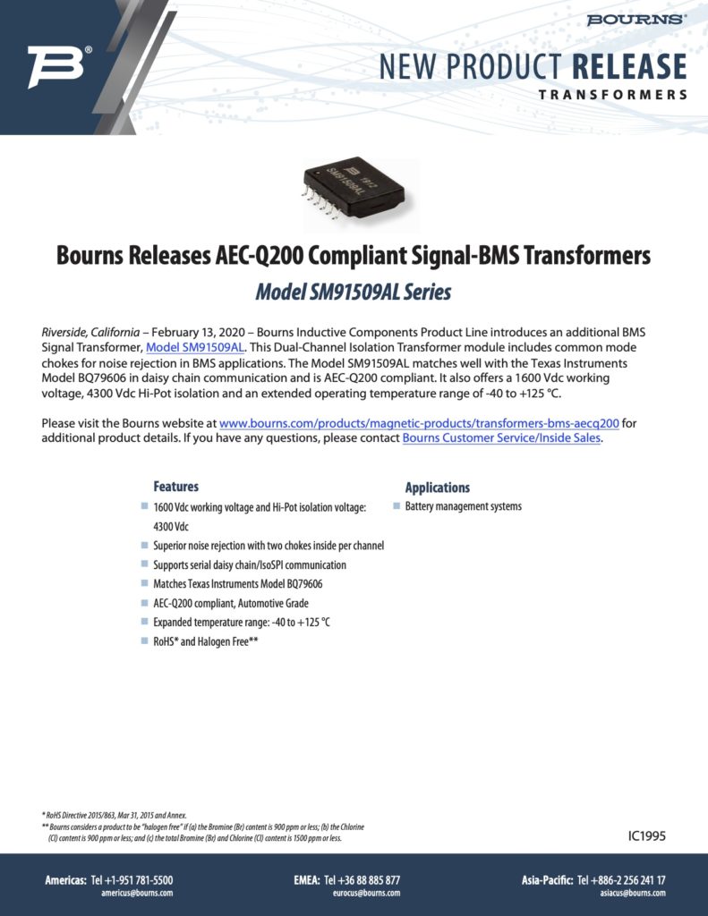BOURNS RELEASES AEC-Q200 COMPLIANT SIGNAL-BMS TRANSFORMERS