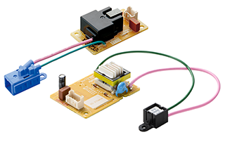 1. Ions are generated by applying a high-voltage direct current to needle-shaped electrodes (metal wires about 70 µm thick). The ions are electrically charged, and the charge catches tiny floating particles by Coulomb force. At the same time, Murata’s ionizers have electrodes formed on a ceramic board surrounding the needle-shaped electrodes, and these generate ozone. The oxidizing power of the ozone effectively disinfects and eliminates odors.