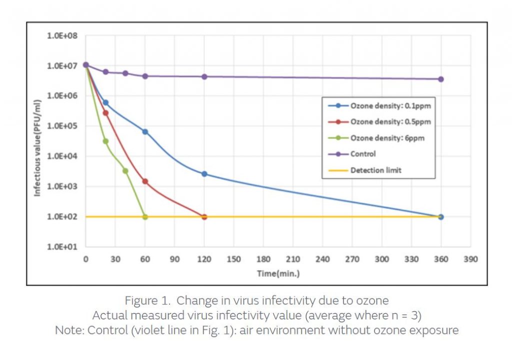 It was confirmed that at least 99.9% of the virus became inactive following exposure for 120 minutes to a concentration of 0.1 ppm, which is the acceptable ozone concentration designated by the Japan Society for Occupational Health.