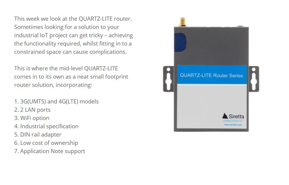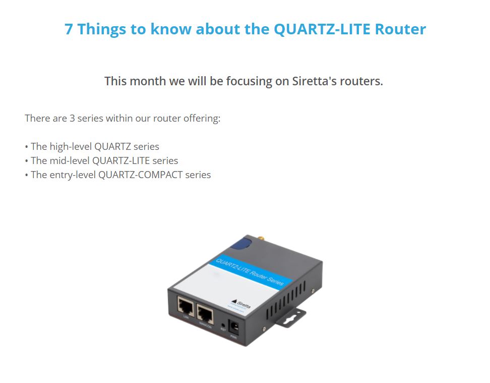 15 Jan 2021 SIRETTA: 7 THINGS TO KNOW ABOUT THE QUARTZ-LITE ROUTER by LT2 | posted in: Other | 0 Why not learn more by checking out the QUARTZ-LITE datasheet. Download the QUARTZ-LITE LTE (EU) Datasheet