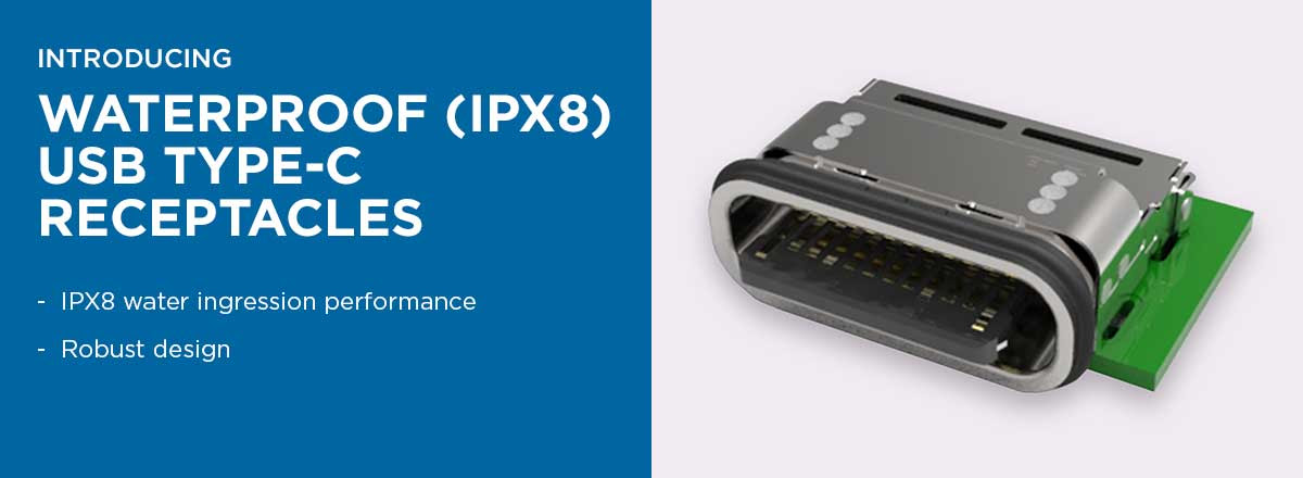 The new waterproof USB Type-C connectors have industry leading IPX8 water ingression performance per IEC 60529. These connectors are designed for use in harsh environment applications where moisture is present. Capable of 10 Gbps data rates, these connectors are rated for USB 3.1 performance and are also capable of transmitting 100W of power at 5A. Added board retention and EMI protection features mean these connectors have a robust design, providing the reliability and quality TE is known for.
