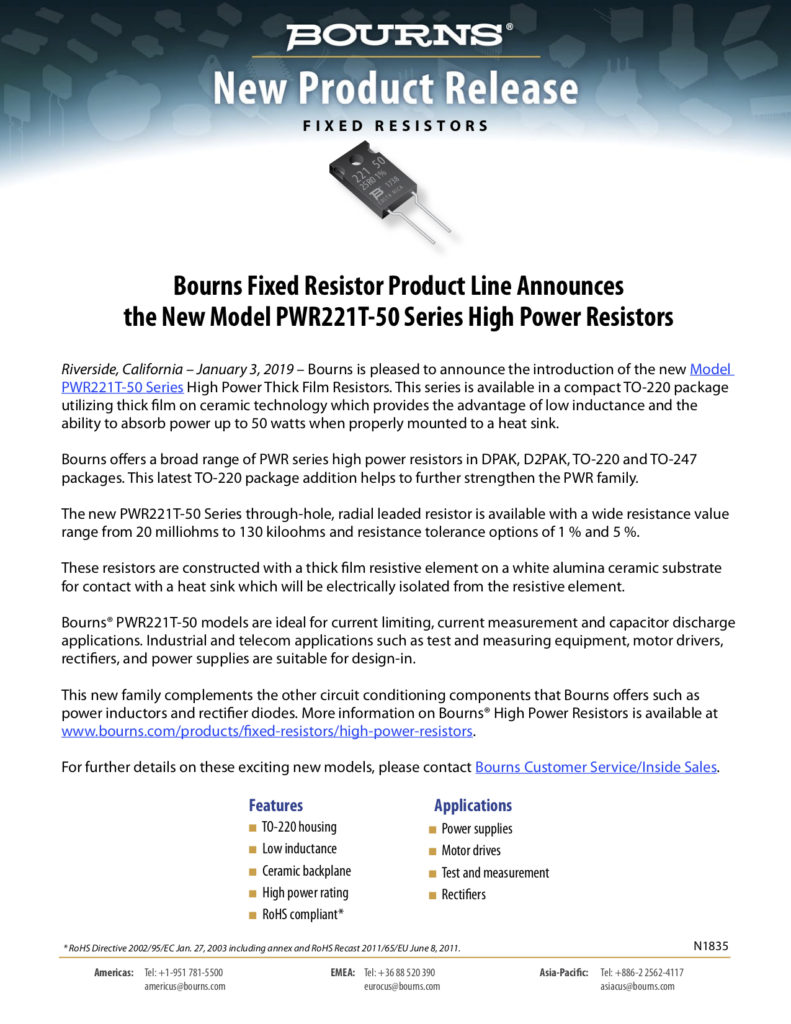 28 Gen 2019 BOURNS FIXED RESISTOR PRODUCT LINE ANNOUNCES THE NEW MODEL PWR221T-50 SERIES HIGH POWER RESISTORS da LT2 | pubblicato in: Altro | 0