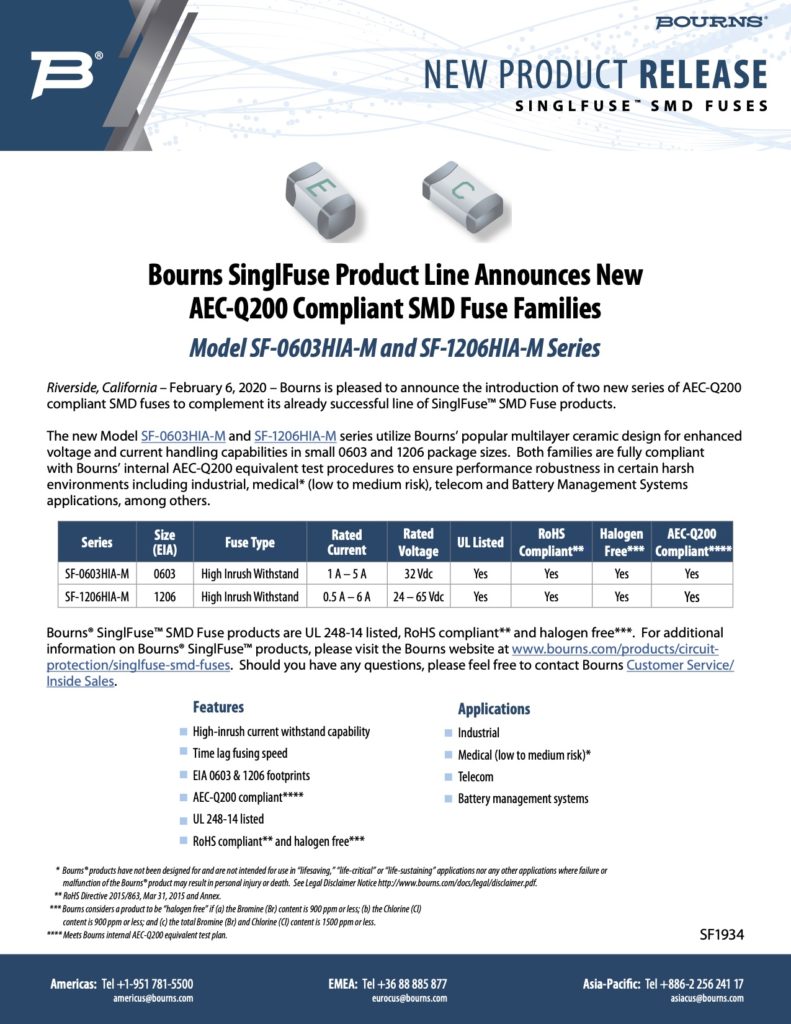 BOURNS SINGLFUSE PRODUCT LINE ANNOUNCES NEW AEC-Q200 COMPLIANT SMD FUSE FAMILIES