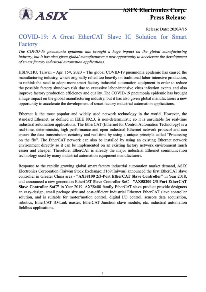 23 Apr 2020 COVID-19: A Great EtherCAT Slave IC Solution for Smart Factory da LT2 | pubblicato in: Altro | 0