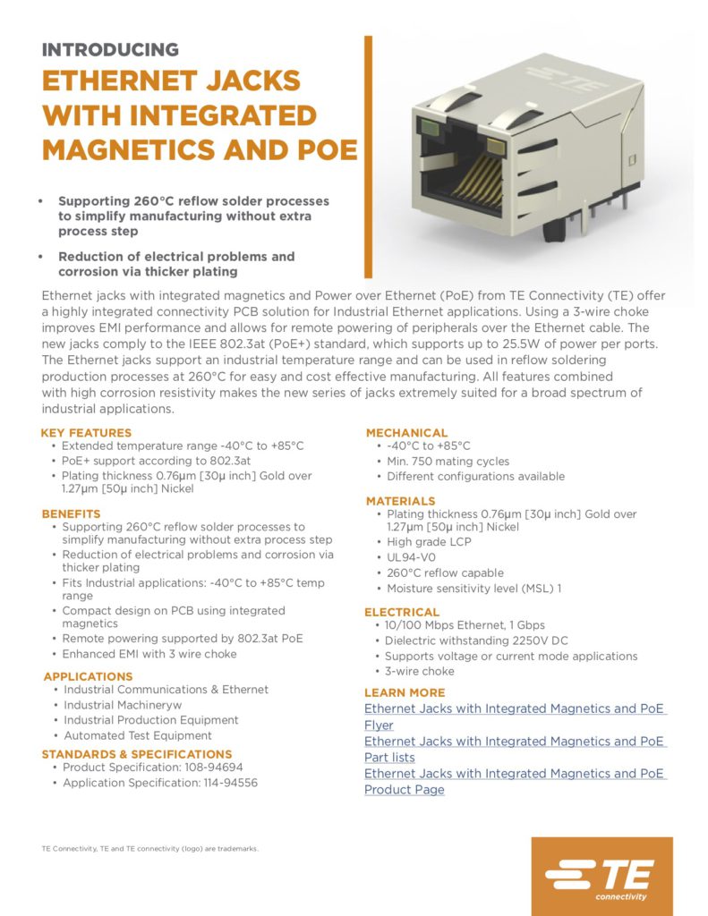 14 Mar 2019 TE: INTRODUCING ETHERNET JACKS WITH INTEGRATED MAGNETICS AND POE da LT2 | pubblicato in: Altro | 0