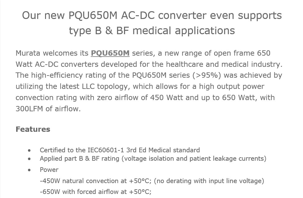 MURATA: NEW PQU650M AC-DC CONVERTER