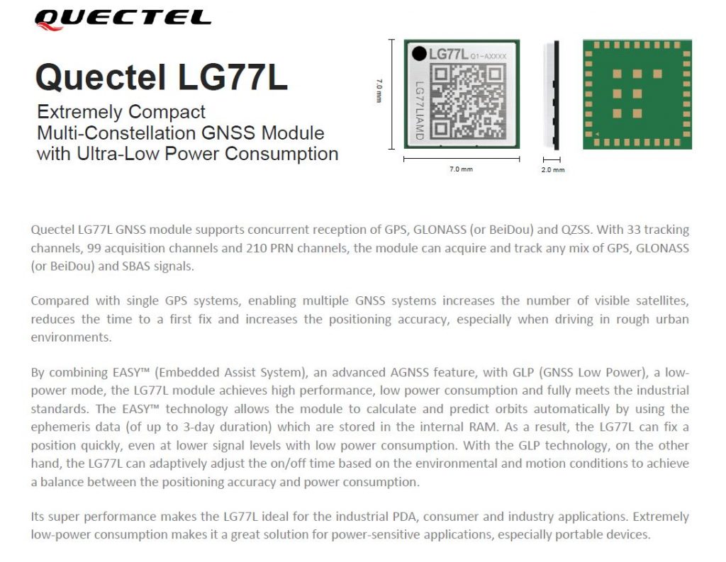 QUECTEL LG77L: Modulo GNSS multi-constellation estremamente compatto con consumo energetico estremamente basso